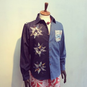 華やかなフラワーモチーフのパッチワークを施したデニムシャツ。